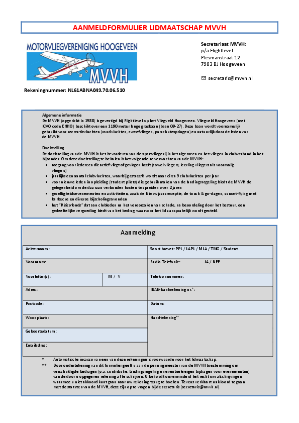 De MVVH (opgericht in 1988) is gevestigd bij Flightlevel op het Vliegveld Hoogeveen. Vliegveld Hoogeveen (met ICAO code EHHO) beschikt over een 1190 meter lange grasbaan (baan 09-27). Deze baan wordt voornamelijk gebruikt voor recreatievluchten (rondvluchten, zweefvliegen, parachutespringen) en natuurlijk door de leden van de MVVH.